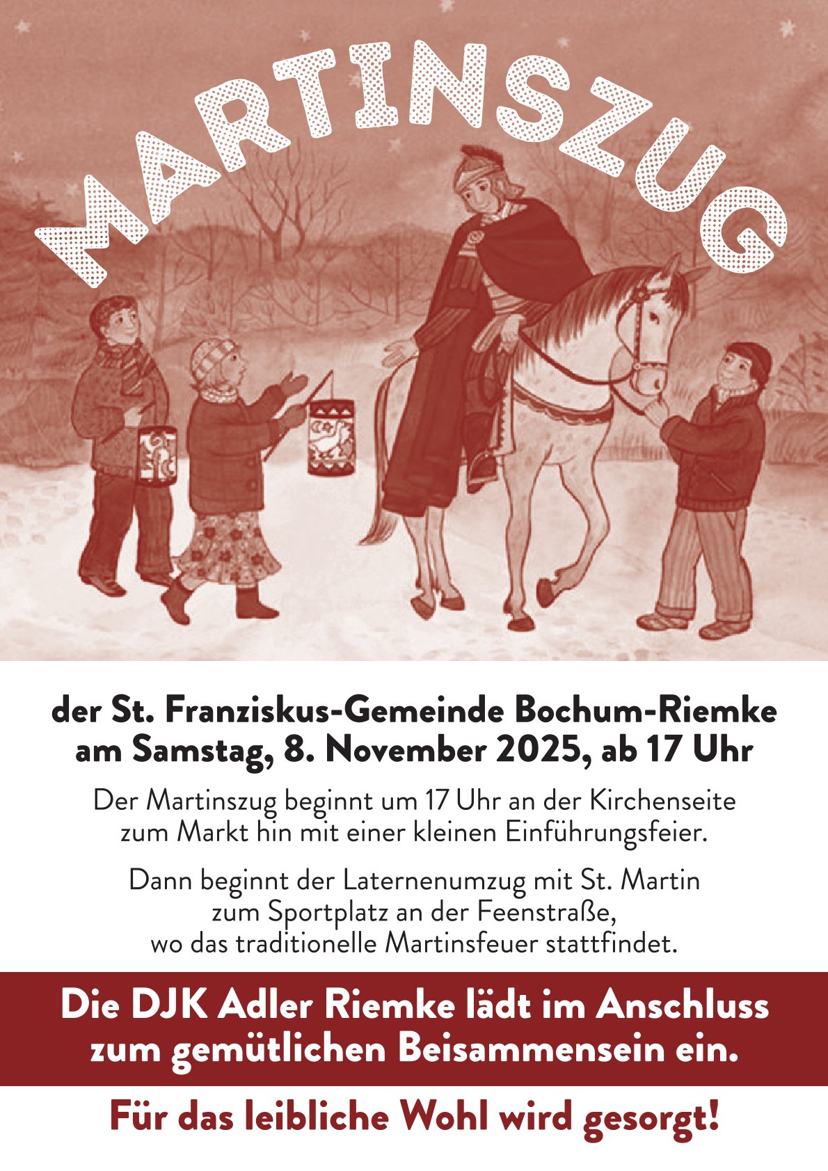 Am Samstag, 08.11.2025 findet wieder der traditionelle St. Martins Umzug durch die St. Franziskus Gemeinde statt. Der Abschluss mit Martinsfeuer und Gesang wird wie immer auf unserer Sportanlage an der Feenstraße stattfinden
