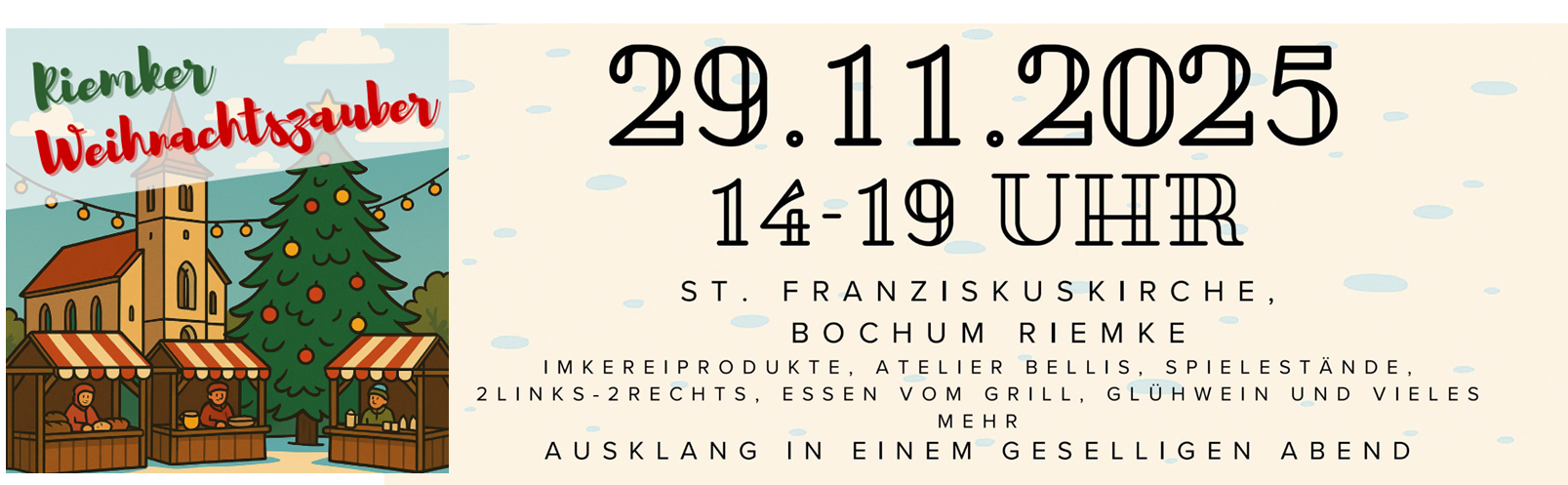 Am Samstag, 29.11.2025 findet in der Zeit von 14.00 - 19.00 Uhr rund um die St. Franziskus Kirche der diesjährige Weihnachtszauber mit einem umfangreichen Programm statt